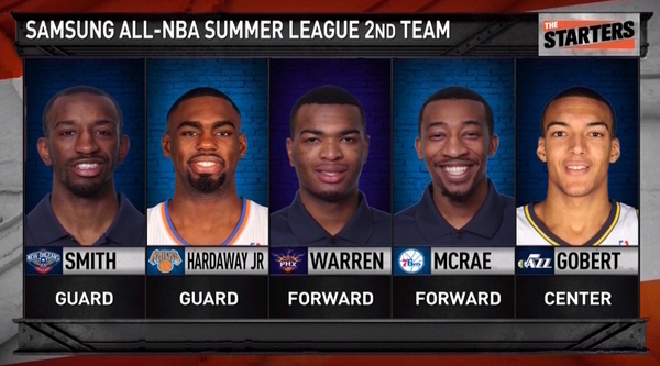 El alero novato Jordan McRae, de los Philadelphia 76ers, fue seleccionado para el segundo equipo tras promediar 21 puntos y anotar un 50% de sus lanzamientos tras cuatro apariciones. Su mejor actuación se produjo cuando los Sixers perdieron (79-68) en la segunda ronda del jueves ante los Bulls, en el Thomas & Mack Center. McRae encestó sus primeros siete intentos y terminó con 7/8 en tiros de campo. Remató su partidazo con 25 puntos, aunque no sirvieron para derrotar al conjunto de Illinois y seguir vivos en el torneo. McRae fue también un defensor de desgaste a los atacantes rivales durante la liga de verano, terminando sus actuaciones con un total de siete robos y tres tapones.